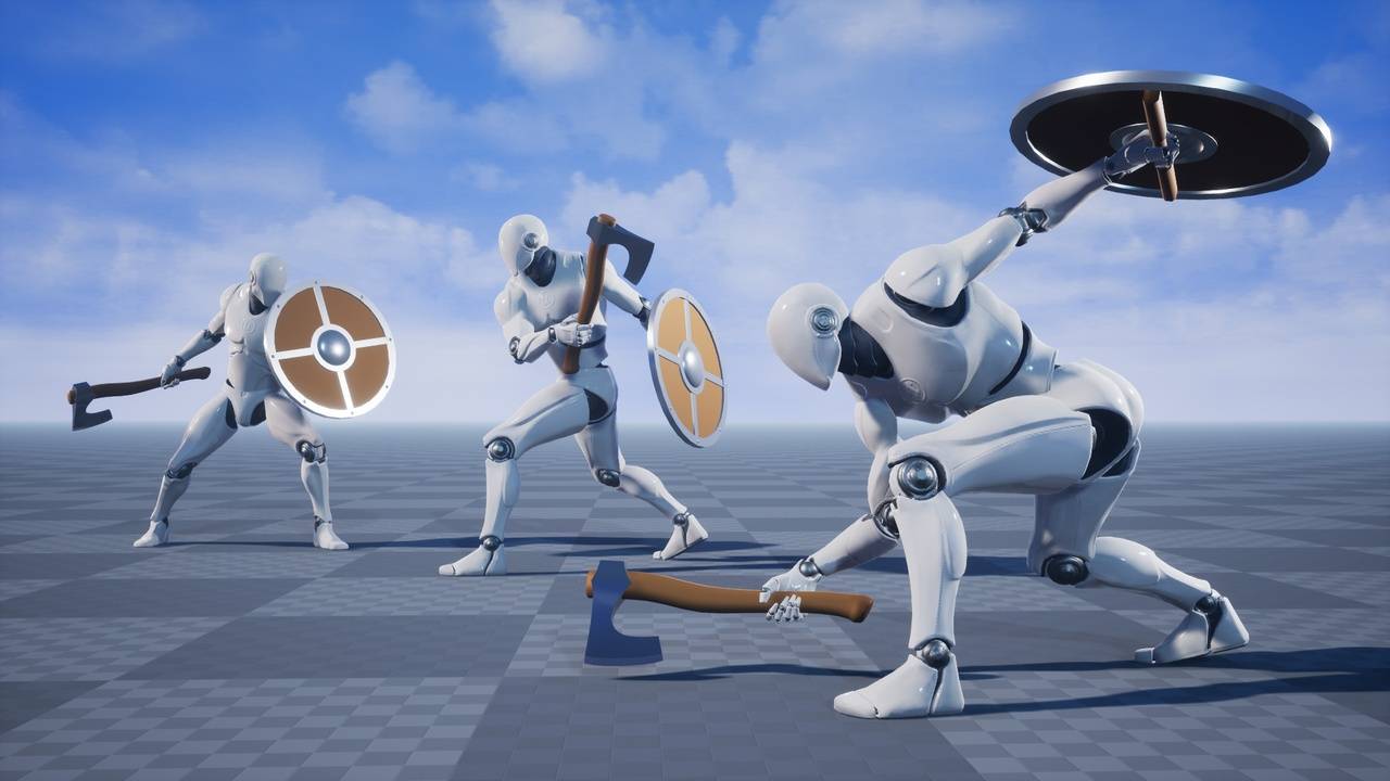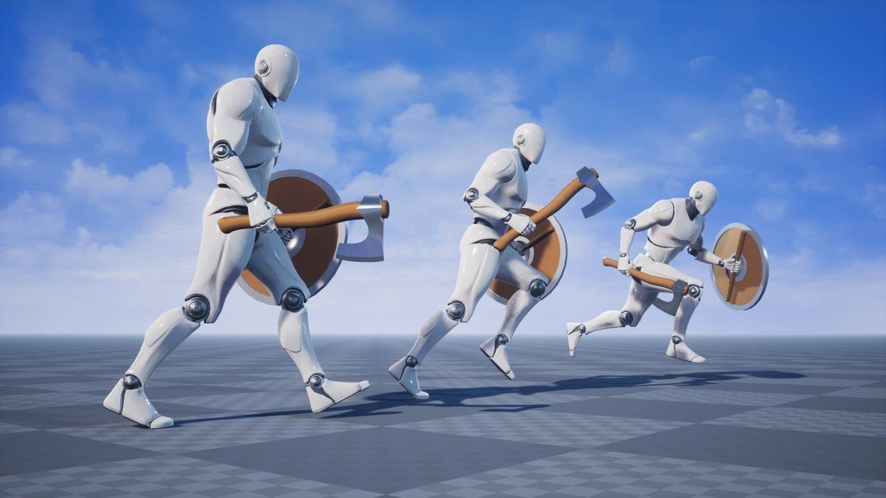 这是一套 63 个手工制作(非动作捕捉)的第三人称动画,角色挥舞着斧头和盾牌。包含占位斧头和盾牌模型,特点:斧盾近战的第三人称动画。包含每种动画的原地运动和根运动变体这仅是一个动画素材,不包含蓝图。支持的虚幻引擎版本4.17 – 4.27 和 5.0 – 5.7