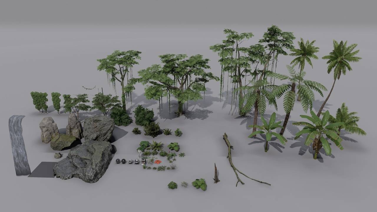 热带丛林套装,63 种丛林资源,从榕树到蕨类植物,均来自东南亚郁郁葱葱的热带地区。适用于任何游戏、建筑可视化、动画等的高质量素材。游戏提供了简单的植被交互功能,但仅支持单个玩家角色。这是一个基于着色器的植被交互系统。该系统利用 Pivot Painter 2 的工具和自定义函数,通过顶点动画模拟与草地和植物之间物理上精确的碰撞。支持的虚幻引擎版本4.22 – 4.27 和 5.0 – 5.7