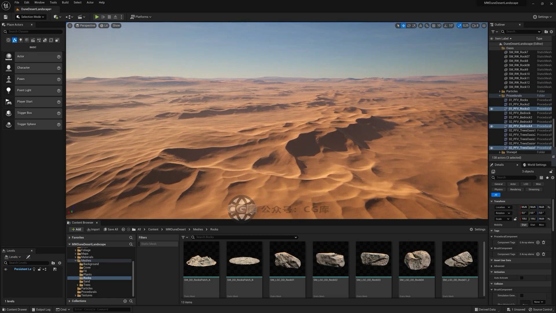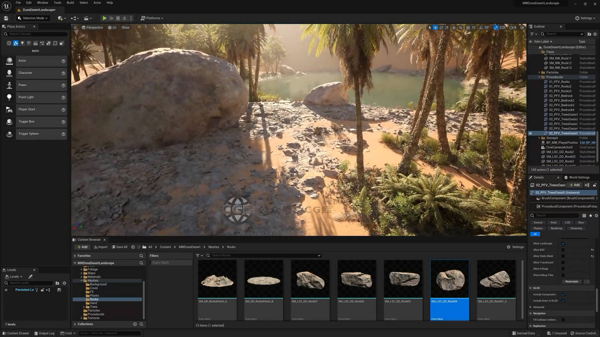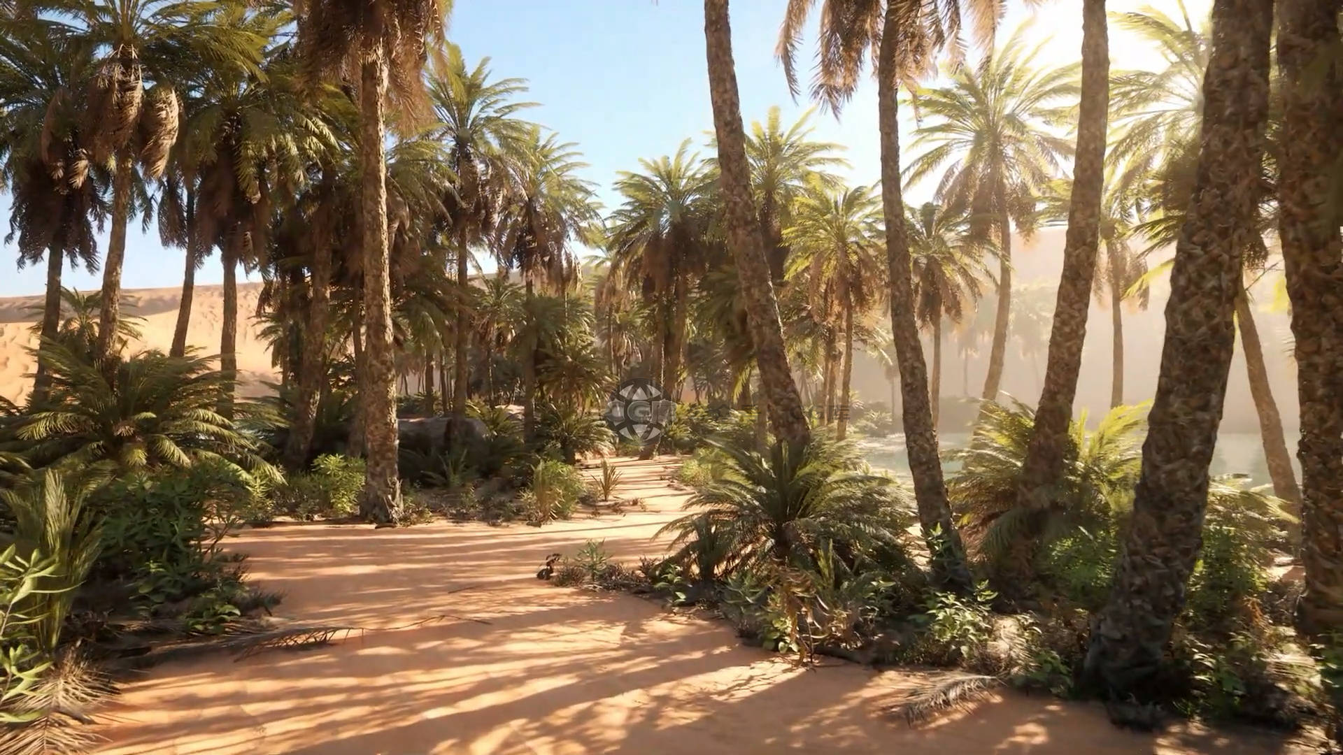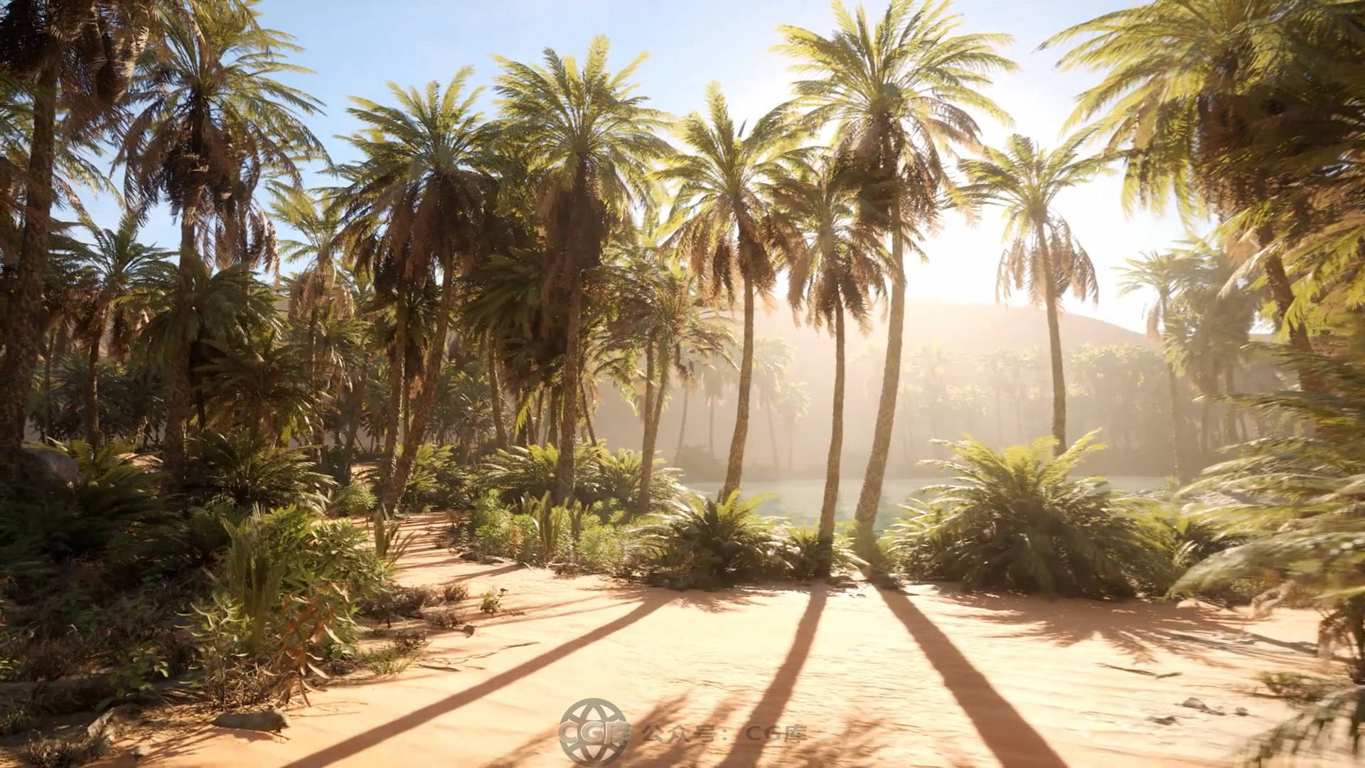 含教程:教程-如何制作沙漠绿洲强大的程序生成:全程序树叶生成或绘画,具有高性能交互式树叶和先进的风力系统。只需点击几下,就可以用数百种植物建造一个极其详细的沙漠绿洲,使用强大的程序生成树叶。先进的材料和功能:先进的地面材料有9种不同的表面类型:各种沙子、绿洲、岩石/石头和泥土,自动生成所有的小地面覆盖物和树叶。程序水坑、风功能只是产品中包含的一些强大的材料功能。共享结构和功能:用于棕榈树、碎屑、岩石和斜坡的Highres Nanite网格