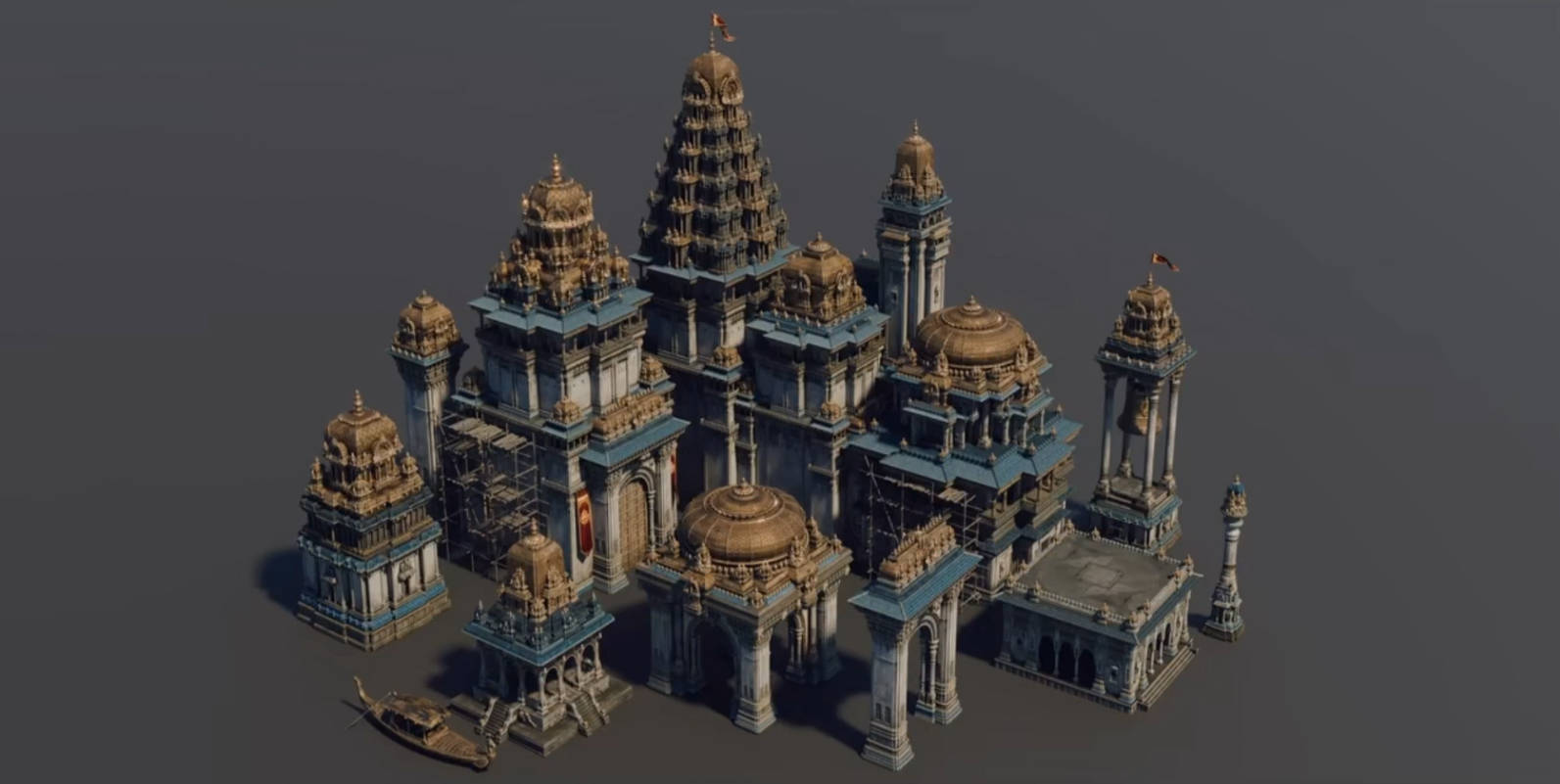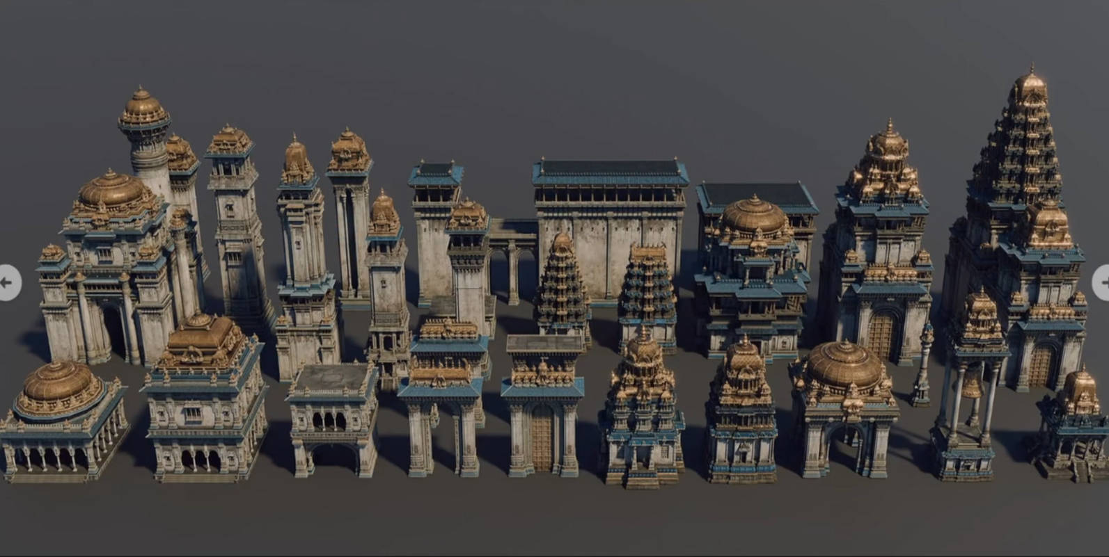 3d套件中的建筑风格灵感源自古代朱罗王朝,印度历史上极为辉煌的一个泰米尔王朝,朱罗王朝以其宏伟的庙宇建筑、精美的雕刻和强大的海上力量而闻名。高耸的塔楼、精美的穹顶 ,以及带有柱廊的结构,南印度的庙宇建筑元素。blender格式,也可导出其它格式供给所有3D软件使用,机会难得赶紧收藏下载吧