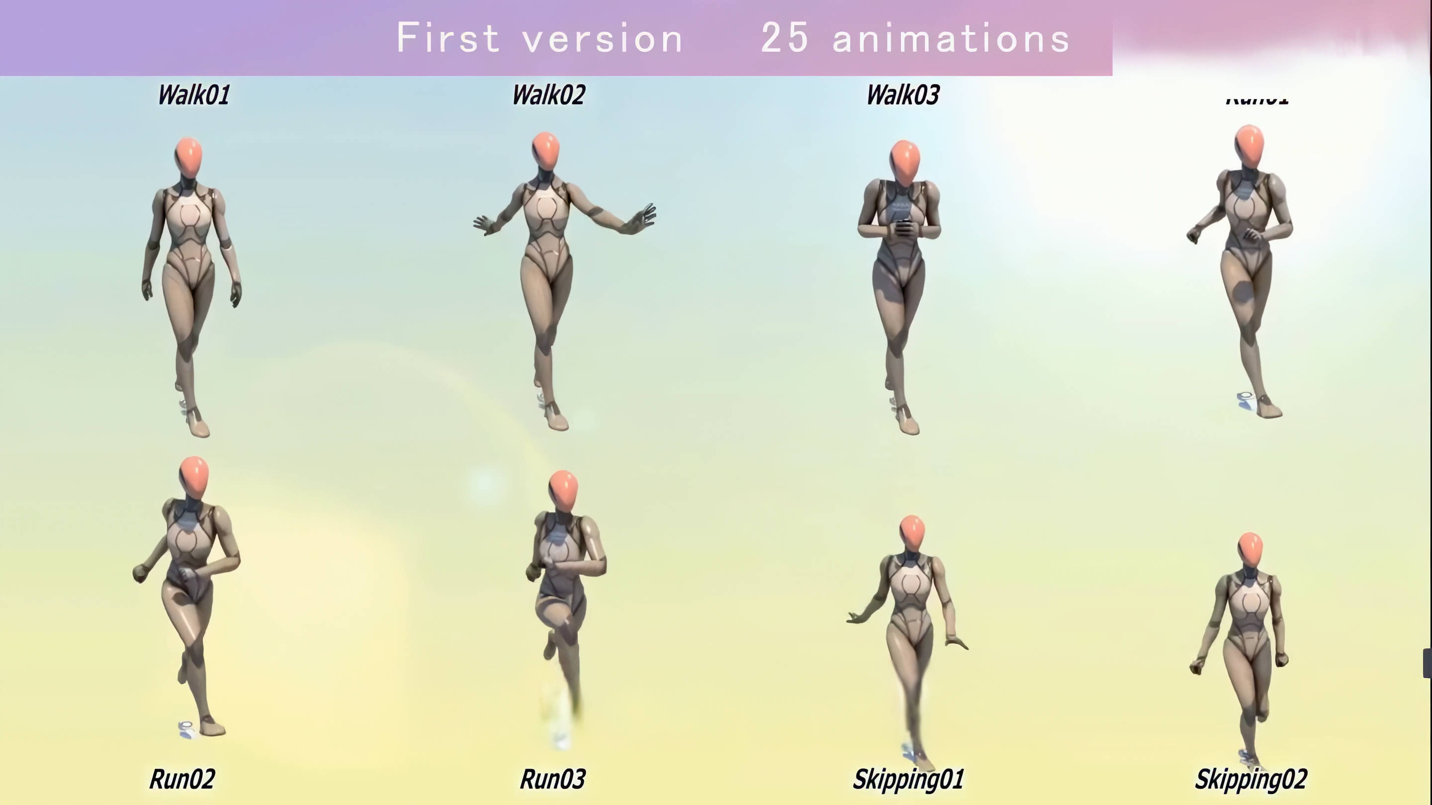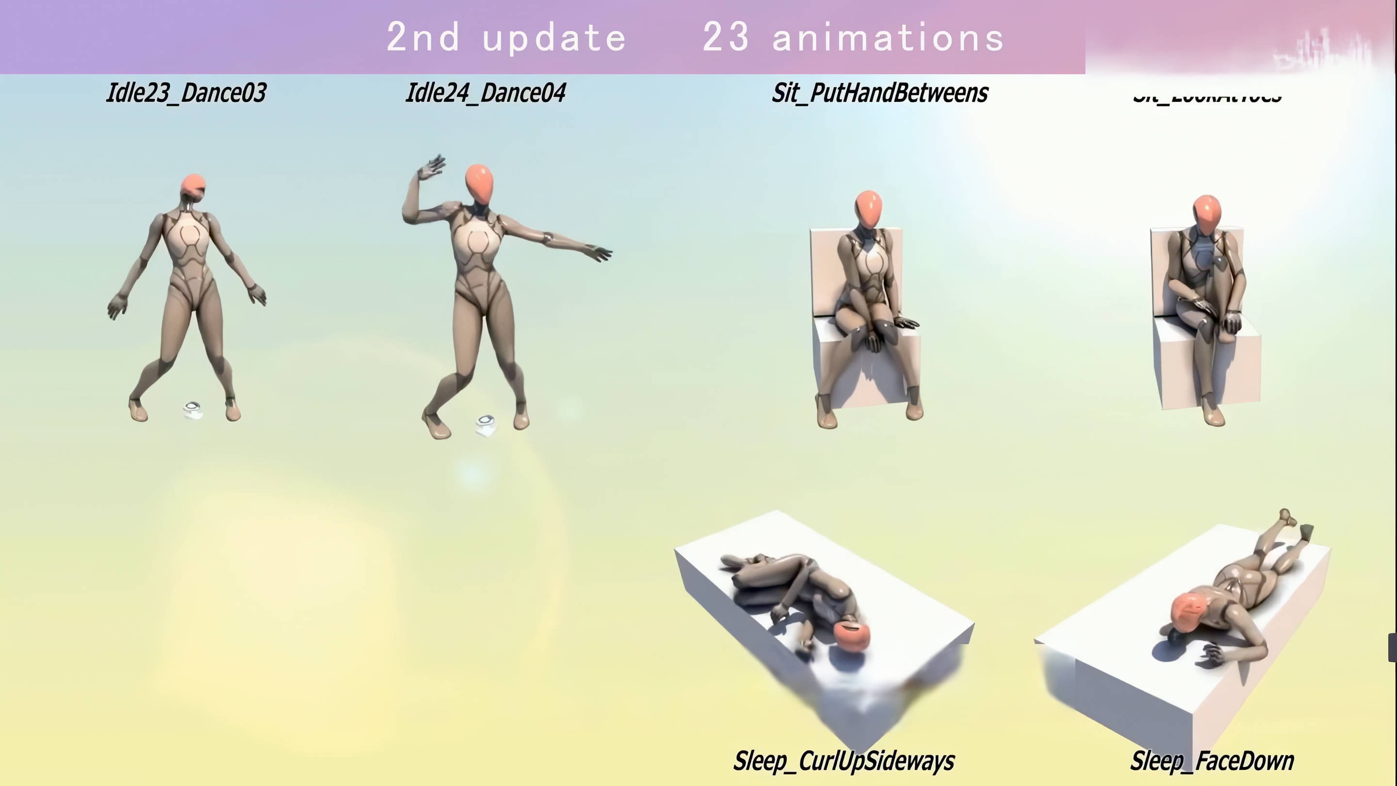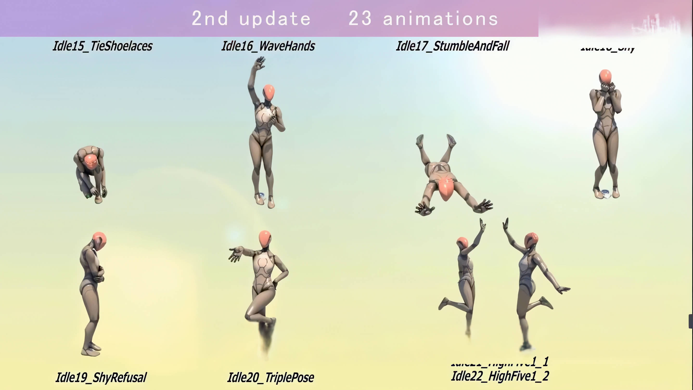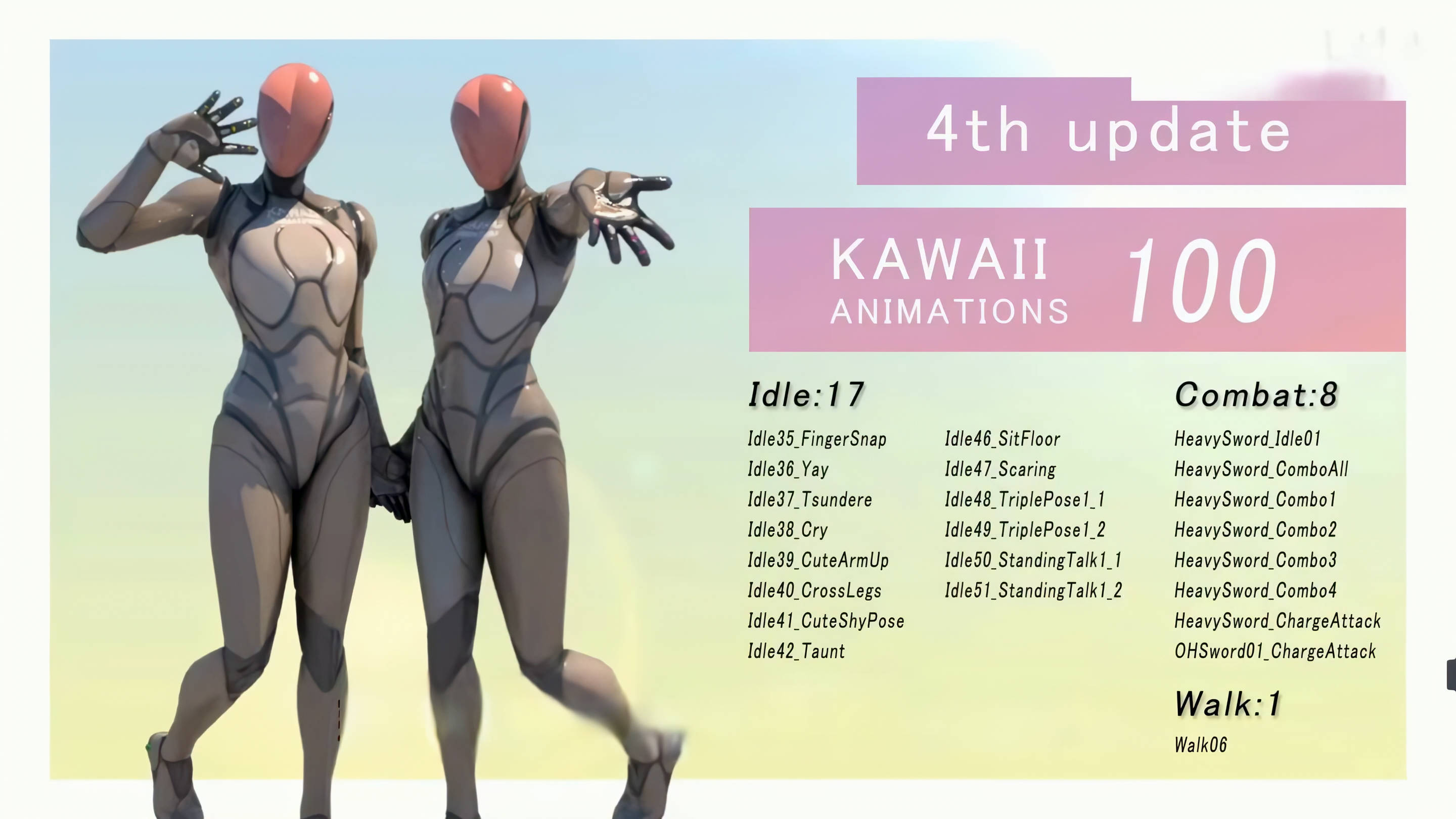 这款在虚幻引擎 5(UE5)以 “可爱(Kawaii)” 为核心风格动画资产包,动作设计充满灵动与俏皮感,无论是角色的挥手、害羞、跳跃,还是行走、奔跑、小憩,都能传递出活泼的情绪,适配二次元、萌系风格的游戏、虚拟形象项目。从最初版本的 25 组动画,迭代至第 4 次更新后已拥有100 组动画,覆盖 ** idle(待机)、combat(战斗)、walk(行走)** 等多维度场景。例如 idle 类包含 “Idle35_FingerSnap(打响指)”“Idle37_Tsundere(傲娇姿态)”“Idle38_Cry(哭泣)” 等 17 种趣味待机动作;战斗类涵盖重剑 idle、连招、蓄力攻击等 8 组动作,满足角色战斗表现需求。
