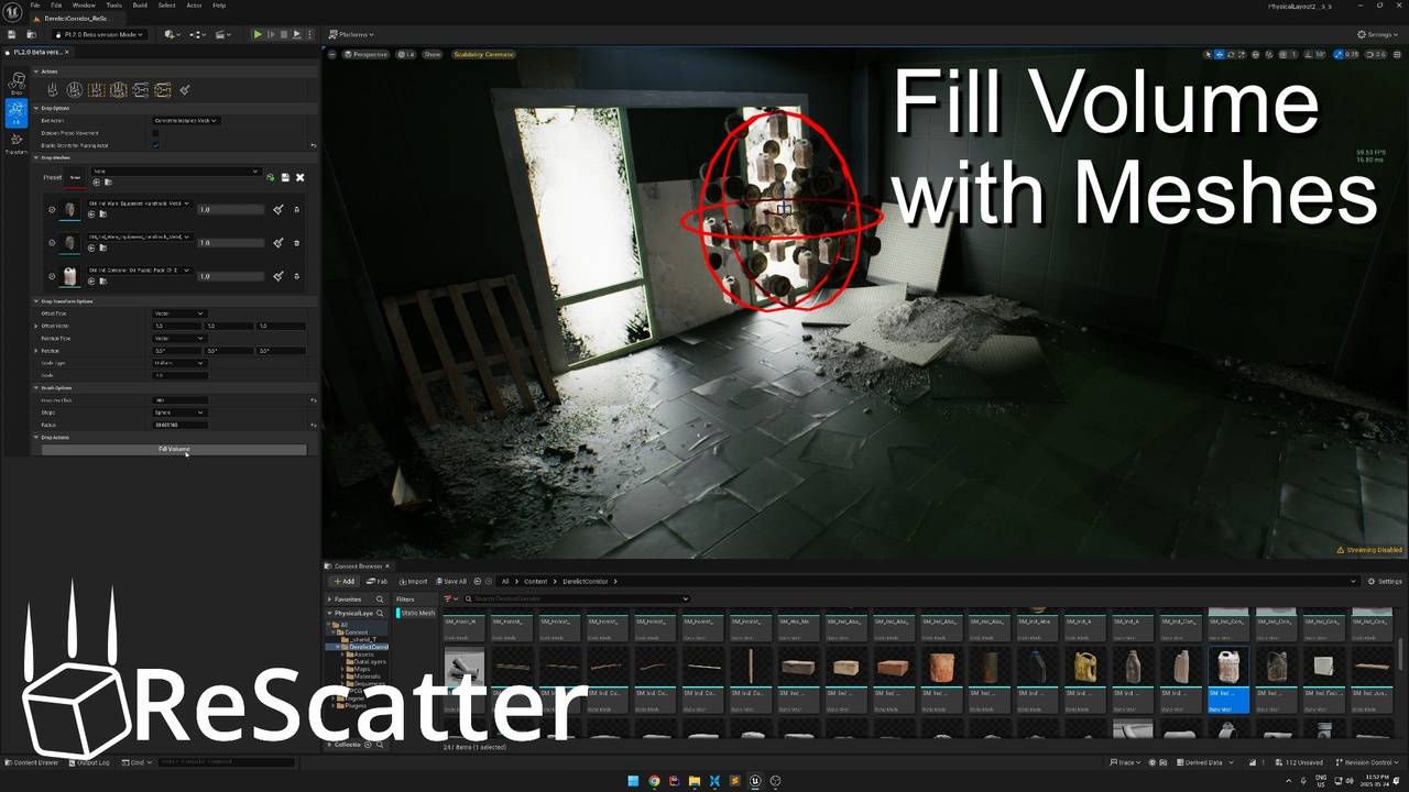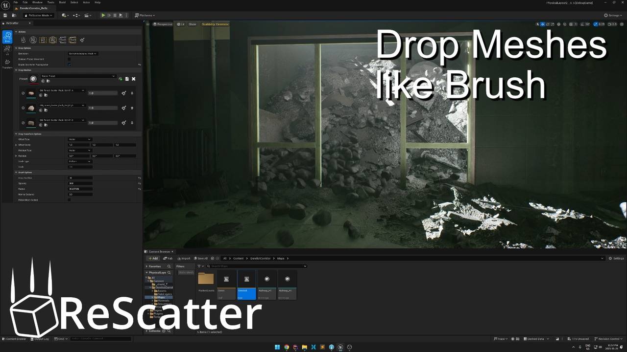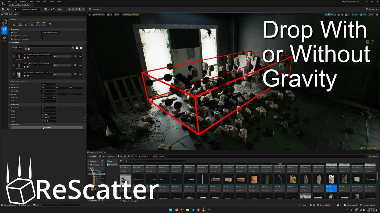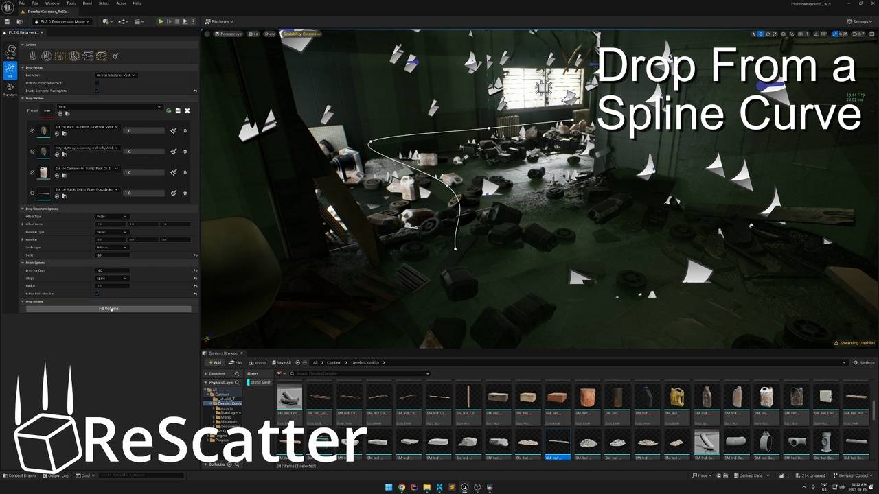 ue5物理布局工具。很多人都在用它来将物体实际散布在地图上。现在非常激动地宣布 ReScatter 1.0 版本发布。现在它是一款功能强大且外观现代的工具,还新增了一些功能,例如在球体、立方体、圆形甚至样条曲线等形状体积中散布对象。您可以将参考网格和笔刷设置保存为预设,以便以后使用。它还支持虚幻引擎的撤销/重做系统。兼容性支持的虚幻引擎版本5.5 – 5.6